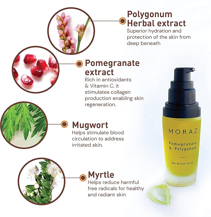 - OUR PROMISE — Originating from Israel, MORAZ is a renowned name in herbal skincare. We develop our serums for skin care with remarkably high herbal concentration. Crafted with love and dedication, this natural anti aging moisturizer serum with Polygonum Aviculare and pomegranate seed oil is sure to become your go-to ally to help reduce the signs of premature skin aging