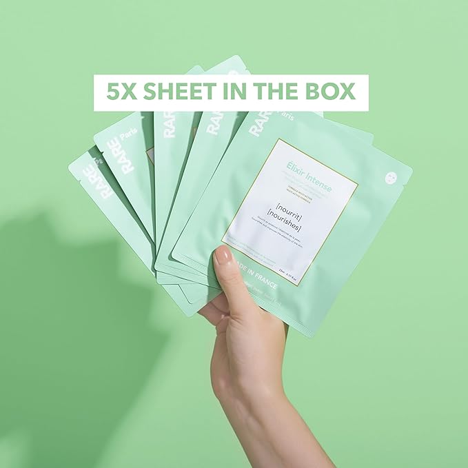 - Élixir Intense Sheet Mask - RARE Paris Élixir Intense facial sheet mask nourishes the skin deeply, hydrating and strengthening the skin barrier. Formulated with Hyaluronic Acid and Squalene, say goodbye to feelings of tightness, dull and dry looking skin. This sheet mask is available in a convenient pack of 5.