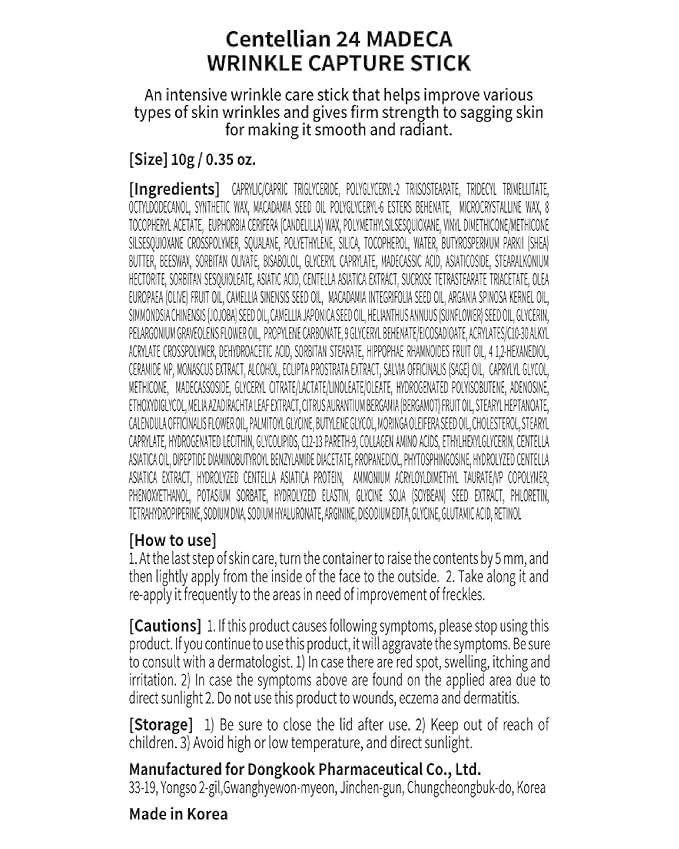 - CENTELLIAN 24 MADECA WRINKLE CAPTURE STICK (10g/0.4oz) - This multi balm stick simplifies your daily wrinkle care routine. Crafted with meticulously selected centella asiatica extract from pristine regions, this stick targets specific areas, including the forehead, eye contours, smile lines, and jaw, promoting a more youthful appearance with a potent blend of TECA (titrated extract of centella asiatica) 10,000 ppm and 200,000 ppm of centella asiatica extract.
