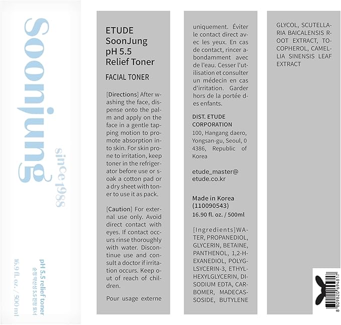 ETUDE SoonJung pH5.5 Relief Toner, Toner for Face, Hydrating Toner for Sensitive Skin, Vegan Face Toner, Panthenol, Madecassoside, Moisturizer, Korean Skin Care, Korean Toner, Beauty (16.90 Fl Oz)
