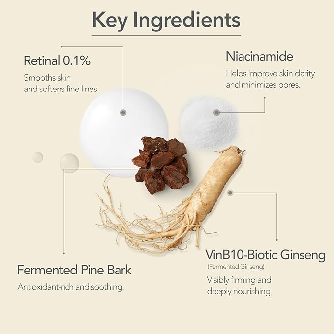 - RENEW & ILLUMINATE : Unlock radiant skin with our advanced serum featuring 0.1% Retinal, a fast-acting vitamin A stabilized with liposome encapsulation for maximum potency. Powered by VINBIOME Complex—10-year fermented black vinegar, probiotics, and prebiotics—it nourishes your skin’s microbiome for lasting health and glow.