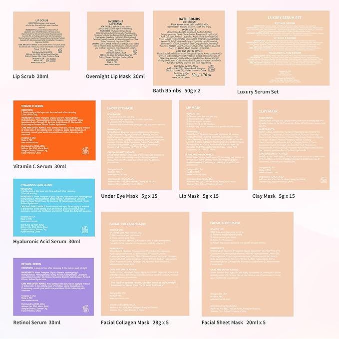 - 55 PCS Advanced Skin Care Set: This complete gift set contains essential oil facial skin care products with 5 pcs sheet mask, 5 pcs hydrolyzed real collagen mask, 15 pcs gel under eye patches, 15 pcs gel lip mask, 20ml lip mask, 20ml lip scrub, 30ml clay mask, 30ml orange face serum, 30ml rose face serum, 30ml hyaluronic acid face serum, bath bombs, lip gloss, spa headband, sock, gua sha tool, hair ties, face clean sponge